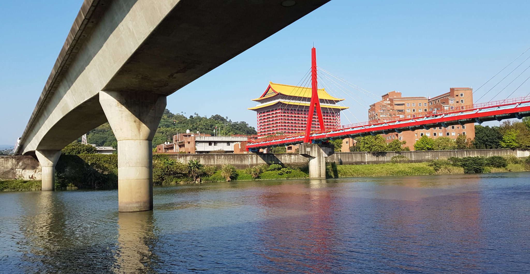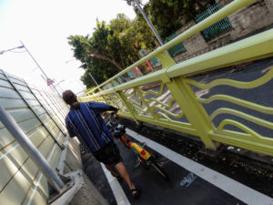 Get off at Dazhi station, take exit 3. Straight ahead as you walk out will be a row of YouBikes (or UBikes). If you haven’t already, register your easy card at the kiosk. Then pick a bike and swipe you card! Adjust the seat and jump on your new bike! Follow the street going in the same direction that you walked out of the Exit 3 to the YouBikes. In just a couple of blocks you’ll come to a T in the road bellow an overpass. Take a right and before you get to the next intersection is a bike/pedestrian ramp for the overpass/bridge. Take it! Over the bridge and then down to the right. And there you are!