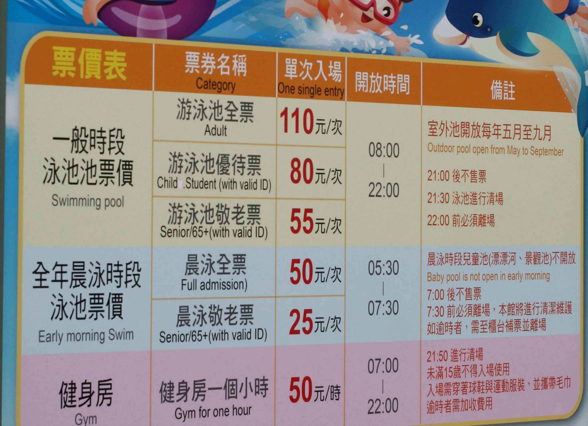 *Details: Josh and I don’t have kids – but if you’re in Taipei with kids this place looks awesome for families! It had a big children’s play area. You can buy hot bowls of ramen noodles & ice-cream from super friendly staff! There are picnic tables and chairs outside. Lockers inside that you can pay a minimal amount to secure your things in and coin operated hair dryers in the bathrooms. Note times & prices bellow. We have heard that this pool can be