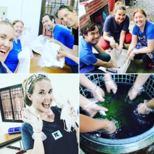 Next, we each choose a pattern to dye our cloth. Then the instructor showed us how to fold and tie our cloth in order to get the desired pattern. After that we washed the cloth in water before doing the first of three indigo soaks. Oh! And of course they also kindly provided gloves, which we made sure to rubber band on tightly, as we weren’t looking to leave with smurf hands!
