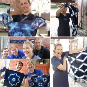 Soaking the cloth in the indigo dye is fascinating – one big surprise is that the dye is green! But once exposed to the air the cloth goes from cloudy swirling green to deep blue. Finally after 3 different indigo soaking cycles we crossed our fingers and unwrapped our bundles. And then squealed with delight (well, at least Pauline did) But we were all very happy with our handiwork.
